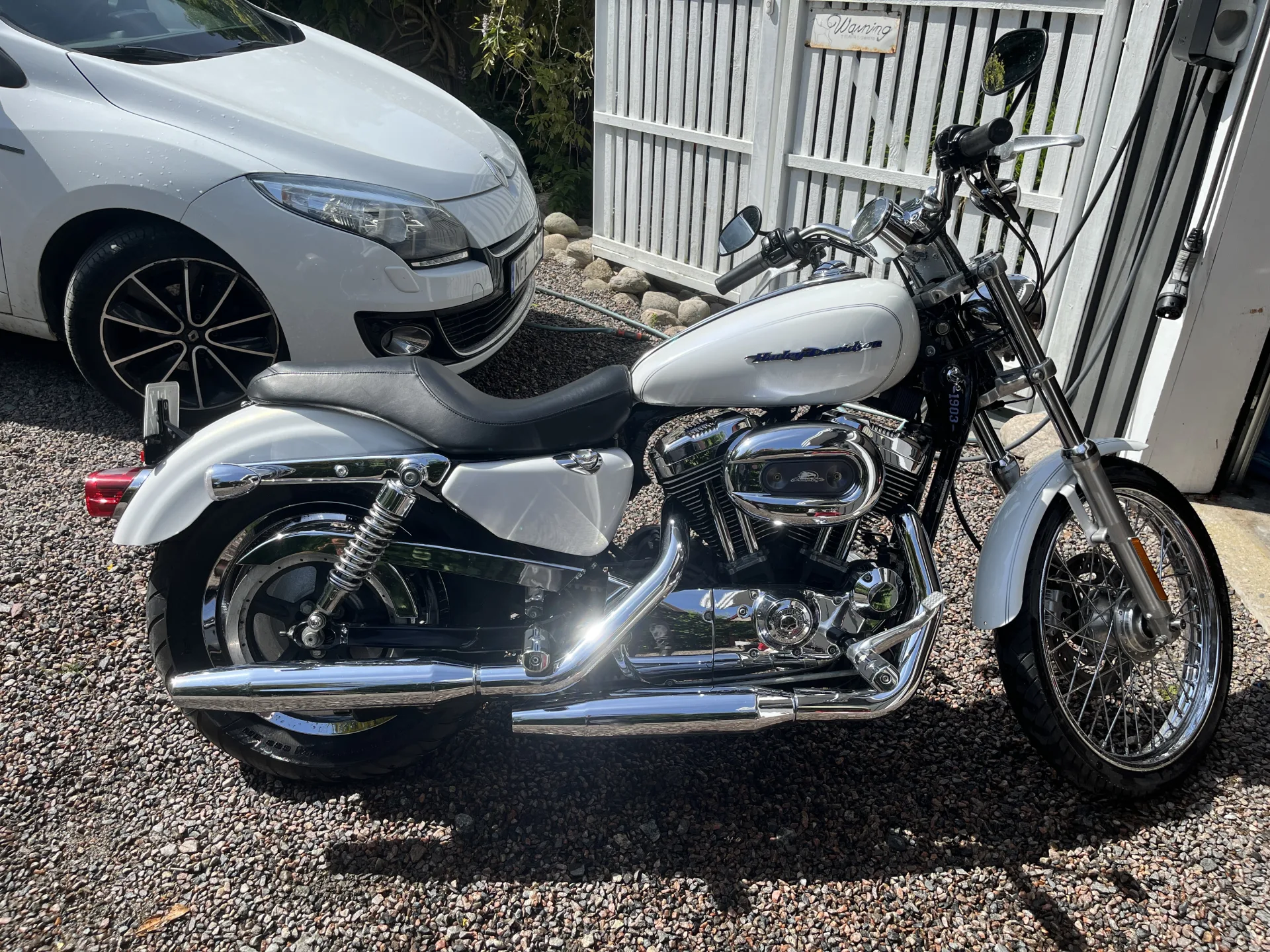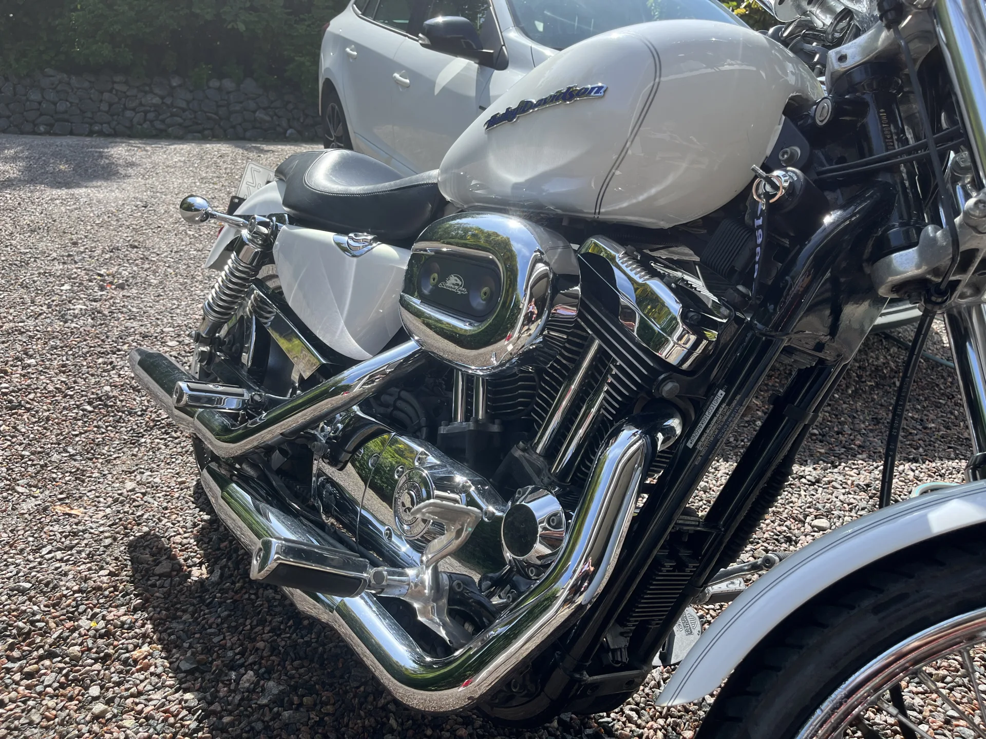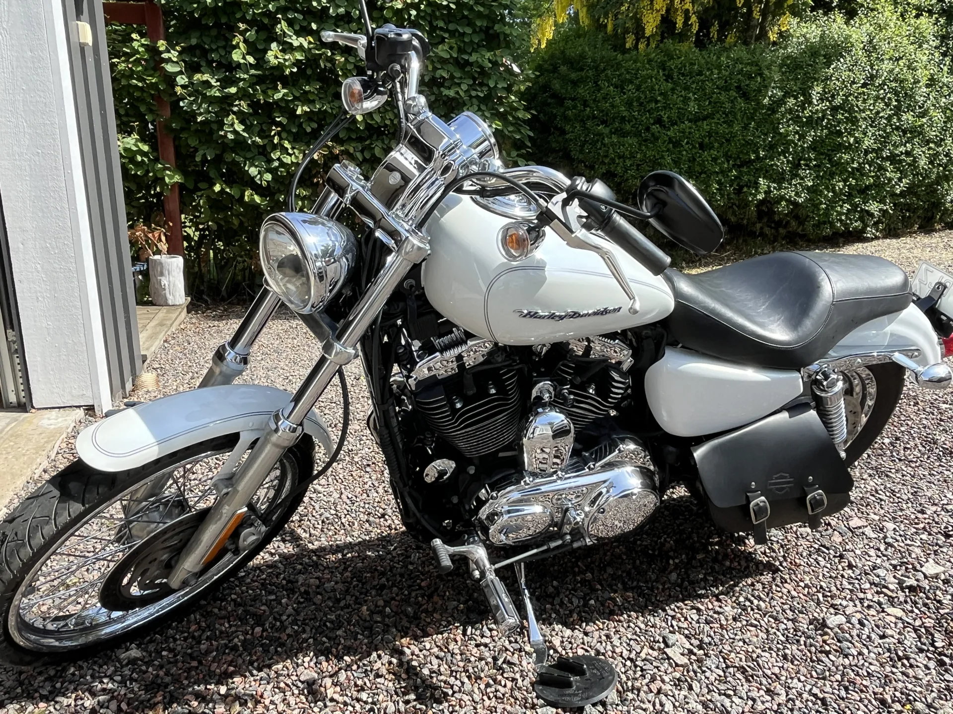 Supersnygg HD Sportster! Pearl White lack. Motor, växellåda, koppling, bromsar i prima skick. Nya däck, gått ca 50 mil. Svart läderväska på vänster sida. Original ljuddämpare medföljer. Hojen går mycket bra med Screaming Eagle-kit (förgasare). Besiktigad utan anmärkning i april 2025. Säljes då ägaren inte lyckas få tid att ta körkort för MC.
