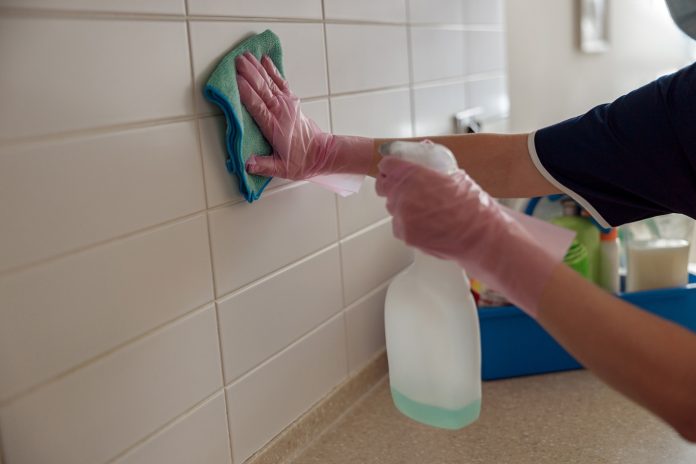 - Kök (fettstänk): Spraya lätt alkaliskt på duk, torka kakel ovan bänk/spis.